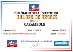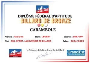 Félicitons à nos 4 nouvelles recrues arrivées en janvier et février pour leur première saison au billard, ils franchissent sans difficulté l’obstacle. Ils obtiennent avec brio leur billard de bronze  avec respectivement Etienne(114pts/120), Laurent(114pts/120), Quentin(104pts/120) et Lucas(97pts/120). On se donne rendez-vous pour la prochaine étape, le passage du DFA Argent la saison prochaine