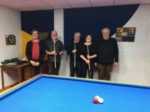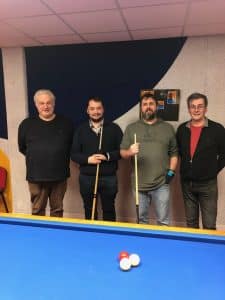 Les 5 candidats ont commencé le billard en septembre 2023 et les premiers cours en octobre de cette même année. Avant l’épreuve, on sentait une certaine tension autour du billard malgré la grande motivation des candidats. Au fur et à mesure des figures et des points réalisés, la tension retombait et les premiers sourires apparaissaient. Enfin, lorsque tous les joueurs ont réalisé que le diplôme ne pouvait plus leur échapper, l’ambiance est devenue beaucoup plus légère et sympathique. Joueurs et encadrants se sont retrouvés autour d’un pot de l’amitié. L’ensemble des candidats a décroché avec brio leur DFA de Bronze. Un grand bravo à eux !!! Tous nos encouragements pour la suite de leur progression.