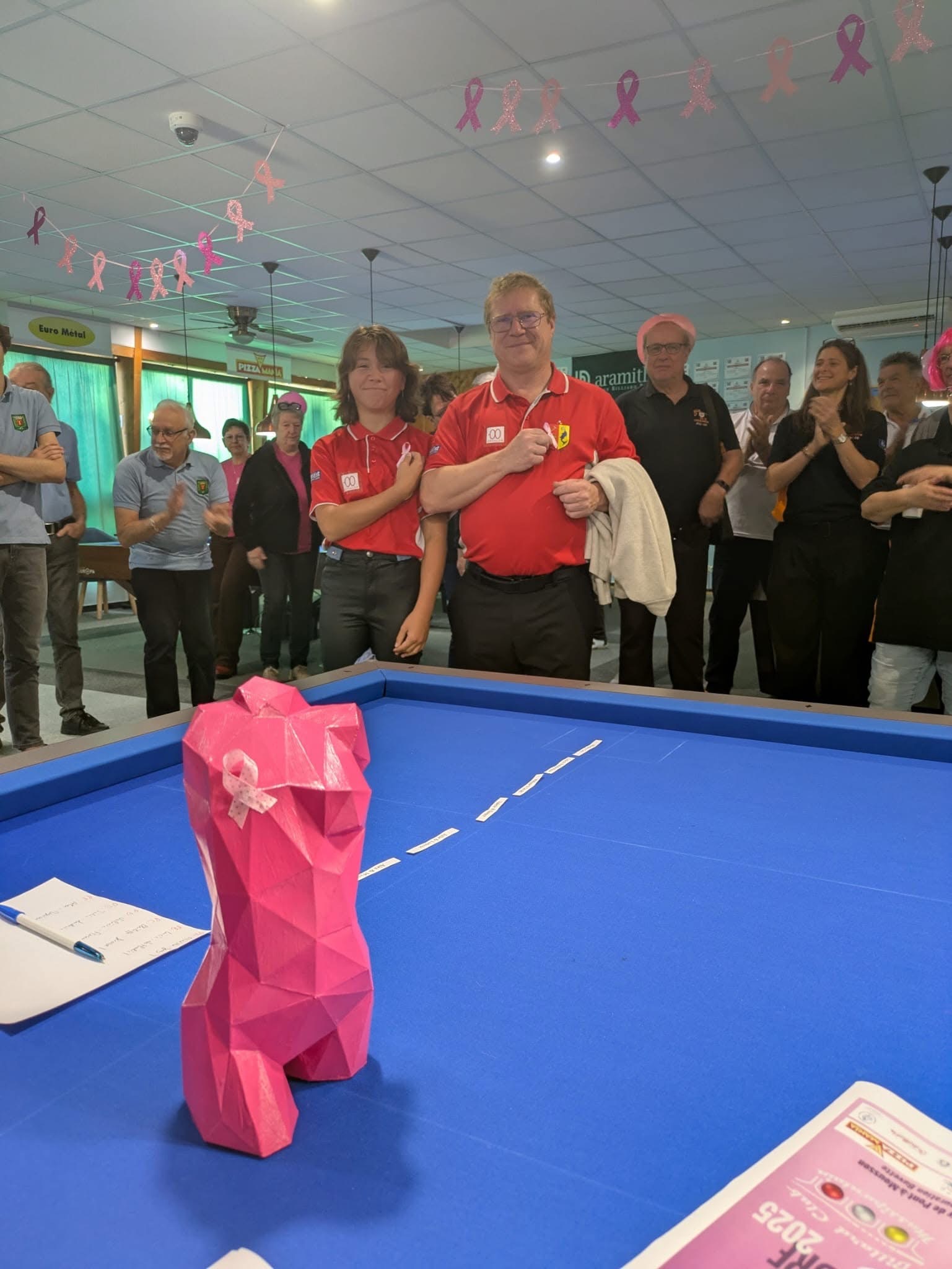 Le samedi 11 octobre 2025 a eu lieu le premier Open Rose à Pont-à-Mousson. Il était réservé aux joueurs de libre R3 max et de bande R1 max et avait lieu dans le cadre d’Octobre Rose. Une vingtaine d’équipes ont répondu présent, certaines venant de GRAUVES, REIMS ou LINGHOSHEIM. Le club de LAXOU était représenté par deux équipes : Cyril et Anaé qui finiront 4ème (derrière les 3 équipes de l’ABSN) et Jean-Luc et Jean-François qui n’ont pu faire mieux que 9ème. La journée s’est passée dans une ambiance conviviale, chaleureuse et décontractée. Tous les joueurs et las arbitres ont déjà pris rendez-vous pour le second Open Rose la saison prochaine.